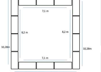 – Gerüstlänge an dessen Innenkante nach Abzug der Fläche für Überlappungen und der nötigen Abstände zum Gebäude: zwei Gerüstflächen mit 7,10m und zwei Gerüstflächen mit 8,22m. Dies entspricht auch den Maßen des Gebäudes, welches mit diesem Gerüst eingerüstet werden kann.