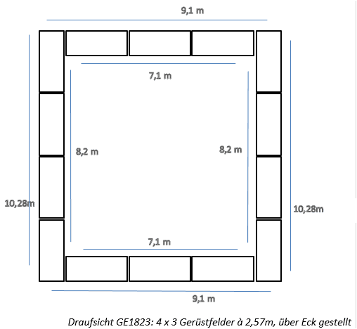 – Gerüstlänge an dessen Außenkante (vom Gebäude abgewandte Seite): zwei Gerüstflächen mit je vier Gerüstfeldern nebeneinander (=10,28m) und zwei Gerüstflächen mit je drei Gerüstfeldern nebeneinander (=7,71m)