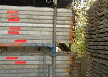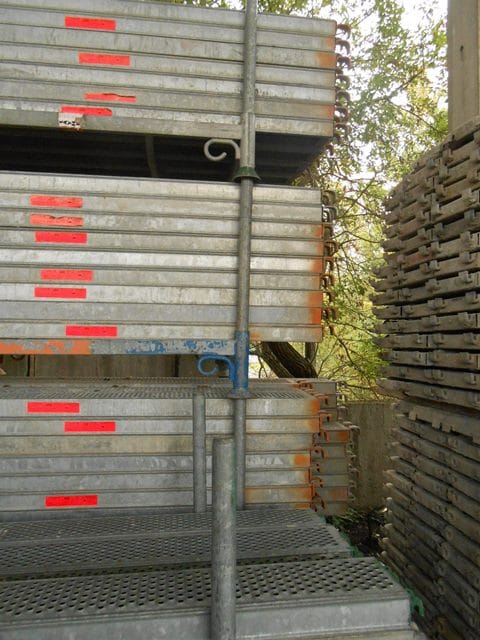 20 gebrauchte 0,19er O-Stahlböden von Layher in 2,57er Feldlänge – für den Einsatz als Zwischenboden auf Podesten oder Konsolen. Auch andere Mengen und Längen machbar.