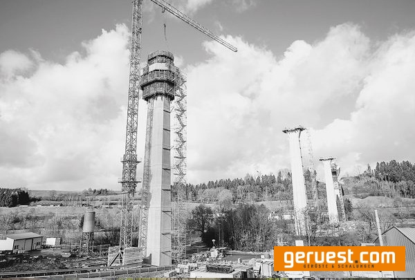 Da es bei dieser Aufgabe technisch einige Besonderheiten gab, wendete sich das Team der Firmengruppe Max Bögl an die Gerüstspezialisten von Layher, wie Tobias Kächler – Geschäftsführer der Layher Bautechnik GmbH – berichtet. „Die bis zu 66 m hohen Treppentürme sollten mit Baufortschritt der Brückenpfeiler errichtet werden. Da sich die Brückenpfeiler nach oben hin erst verjüngen und im Bereich des Brückenkopfes zur Aufnahme des Brückenlagers anschließend wieder aufweiten, wurden die Treppentürme dabei mit einem Abstand von bis zu rd. 5 m aufgestellt und nur unterhalb der Kletterschalung verankert, um diese nicht zu beeinträchtigen. Ein besonderes Augenmerk lag deshalb auch auf der sicheren Ableitung der Horizontallasten.“